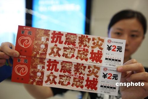 5月18日,北京地铁首次发行的“特种”爱心附捐车票出现在北京地铁所有车站售票台,这套附带为地震灾区捐款献爱心的文化车票受到了市民的青睐,北京地铁公司将把附捐的40万元爱心款全部转交中国红十字会。这套爱心附捐车票发行总量为10万套,每张车票售价4元,其中包括2元捐给灾区的款项。中新社发 老罗 摄