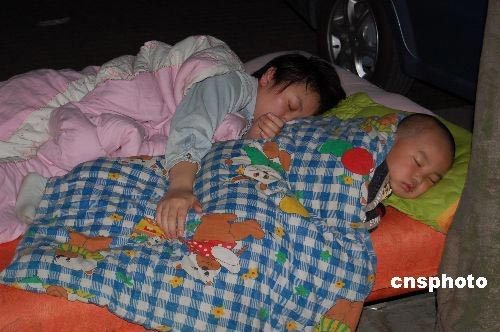 5月20日凌晨,四川成都众多市民纷纷露宿街头防止余震伤害。四川省地震局19日晚发出公告称,汶川余震活动水平为6—7级左右,5月19日至20日汶川地震区附近余震发生的可能性较大。中新社发 刘万强 摄