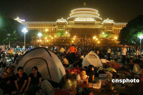 5月20日凌晨,重庆人民广场内,大批当地市民在此搭建帐篷过夜。19日晚21时30分许,重庆市人民政府发布信息称,19日至20日,在汶川震区附近有可能发生6至7级余震,重庆各地将会有明显震感。并提醒广大市民注意安全,按防震知识做好防范工作,注意相互帮助、维护公共秩序。信息发布后,大批当地市民开始聚集广场、平地等开阔地带过夜。中新社发 郭晋嘉 摄