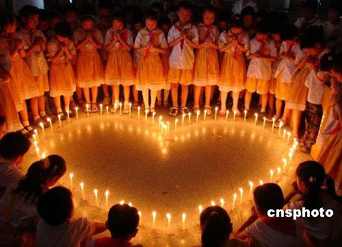 图:小学生点燃蜡烛为灾区祈祷