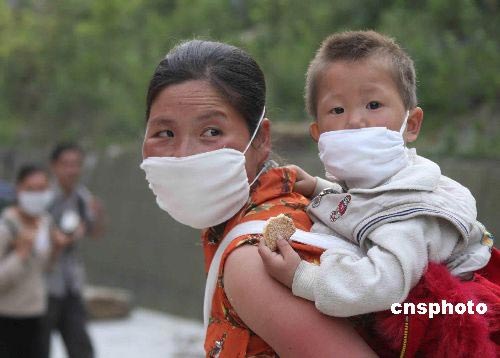 四川地震灾区中的一对母子。 中新社发 曾宪平 摄