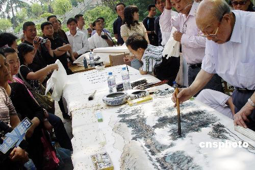 五月二十日,书画家在郑州紫荆山公园作画赈灾。当日,由河南省慈善总会、省文化厅主办,河南省嵩阳书画院承办的“翰墨丹青献爱心”大型赈灾书画义卖活动在此举行,所得善款将全部转至四川地震灾区。 中新社发 李志全 摄