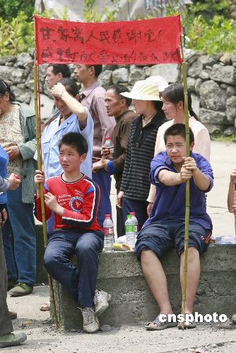 5月19日下午,四川省什邡市红白镇从深山里逃出来的两名儿童在路旁手举标语,感谢救助他们的好人。