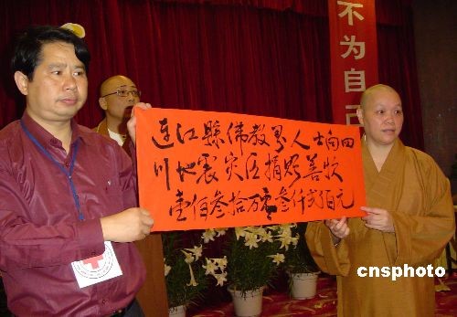 五月二十日上午,由福建省连江县佛教协会主办的“向四川地震灾区捐款的爱心募捐活动”,在连江县城举行,三千余名连江县佛教四众弟子踊跃捐款献爱心,共募集捐款一百三十多万元人民币。图为连江县佛教协会会长界渡法师,将一百三十多万元善款转交连江县红十字会汇往四川灾区。