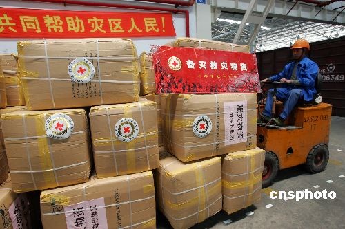 5月20日,又一批医疗器材、药品在上海市长韩正的指挥下,从上海紧急运往四川灾区。截止到19日,上海连续紧急调集并运往灾区抗震救援物资达1127吨,价值2954.43万元。图为工人在加紧搬运救灾物资。