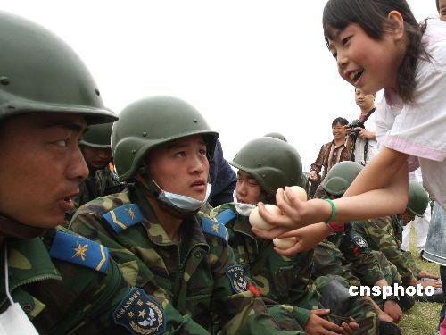 5月20日,四川德阳地区受灾民众手捧家中的鸡蛋慰问解放军官兵。中新社发 赵振清 摄