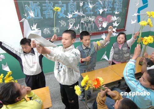 5月21日是全国哀悼日最后一天,辽宁省锦州市古塔区培智学校的300名智障小学生用双手叠制了1000只纸鹤,还买来黄菊花悼念地震逝去的小朋友,放飞心愿,为灾区人民祈福。中新社发 李铁成jz 摄