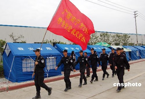 5月21日,支持四川地震重灾区的中国各地特警,主要任务从抢险救人转为维护灾区社会秩序,图为广西南宁公安局特警抢险救灾突击队在重灾区都江堰市的受灾群众安置点进行巡逻。中新社发 刘万强 摄