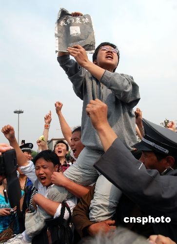 5月19日,全国哀悼日,民众在北京天安门广场挥舞着国旗,为四川加油,希望受灾民众早日度过难关。中新社发 李京生 摄