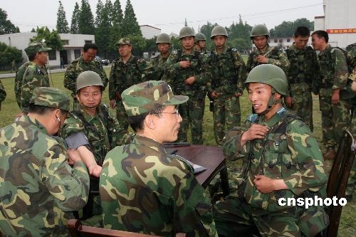 5月20日晚,辗转奋战在四川震中灾区地带的15名中国空降兵返回成都某军用机场。空降兵某部300余名官兵在机场欢迎15勇士凯旋。完成第一轮抗震救灾任务的15勇士原地待命,随时准备执行新的救灾任务。这15名空降兵自5月14日12时25分伞降震中地带茂县后,就担负起了震中地带通信联络、灾情勘察、情况上报等抗震救灾任务。图为空降兵接受身体检查。中新社发 孙久奎 摄