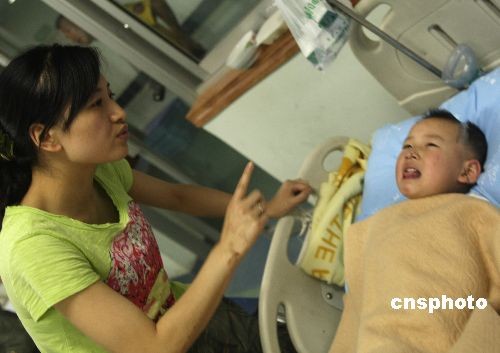 5月21日,在四川汶川5·12大地震中被救出后向解放军“行队礼”的北川3岁男孩郎铮在绵阳市解放军某医院成功完成断臂续接手术,精神面貌很好。图为郎铮与妈妈吴晓红进行语言交流。中新社发 赵振清 摄