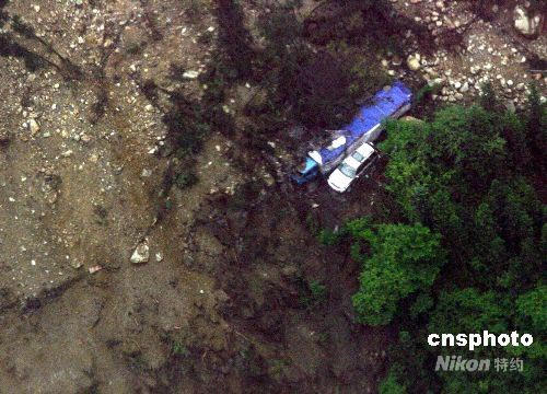 五月二十一日,在重灾区映秀镇外围上空随处可见塌方公路上汽车遇险时惊险万分的情景。中新社发 贾国荣 摄
