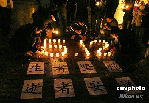 5月21日晚上,沈阳市下起了大雨,但大雨没有挡住市民哀悼的心情,大家自发的来到沈阳市政府广场用烛光等形式哀悼四川汶川地震遇难同胞并高呼“汶川加油,四川雄起,中国加油”等口号。中新社发 黄金昆 摄