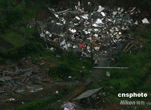 五月二十一日,汶川大地震第十天,从空中可见一位偏远山村的幸存者回到地震倒塌的家园,面对废墟。中新社发 贾国荣 摄