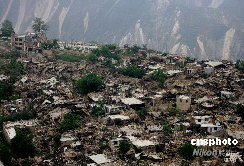 5月22日是汶川大地震第十一天,空中鸟瞰汶川县城十余公里外的一座羌族山寨震后变为废墟,令人惨不忍睹。 中新社发 贾国荣 摄