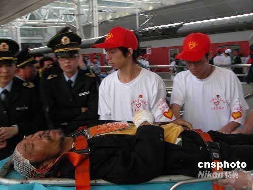 5月22上午,运送着243名四川地震灾区伤员的云南爱心专列从江油抵达昆明火车站。图为志愿者用担架护送一位重伤病者上救护车。中新社发 保旭 摄