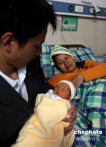 5月23日,李美川(右)和丈夫李应刚在绵阳市第三人民医院细心照顾小宝宝李虹升。5月17日,孕妇李美川被武警官兵从地震重灾区北川县漩坪镇护送出来后顺利分娩,母子现在一切安好。中新社发 黄荣 摄