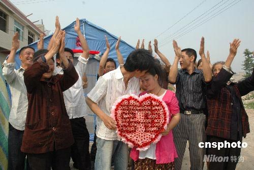 5月22日,在汶川大地震重灾区——四川安县黄土镇马村境内的临时灾民救助点里,新郎肖建平与新娘熊招邻举行了帐篷婚礼。灾难会带给人们创伤,但是无法磨灭人们对美好生活的向往。中新社发 涂萍 摄
