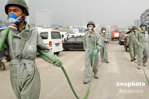 5月23日,中国空军某部官兵在地震灾区绵竹汉旺街头展开消毒防疫。中新社发 陈文 摄