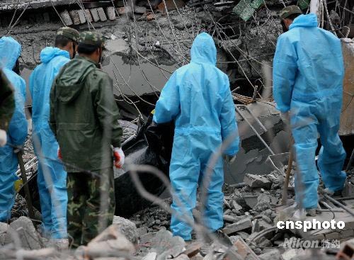 武警官兵五月中旬开始清理汶川大地震受灾严重的映秀镇,他们在漩口中学每一次挖掘出来遇难学生的遗体时,都沉痛默哀。中新社发 贾国荣 摄