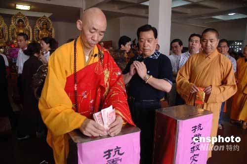 5月24日,历时三天的福州雪峰寺、万佛寺僧众为汶川特大地震受难同胞祈福法会,在福州闽侯万佛寺揭幕。在首场法会上,原福建省政协副主席金能筹(前排左二)、雪峰寺方丈释广霖(前排左一)等率众向灾区同胞捐款祈福。中新社发 郑祚声 摄