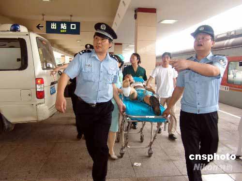 5月24日,从四川德阳开往长沙的救15/4次列车抵达长沙火车站。此趟列车共有238名来自四川地震灾区伤员来长沙接受救治,伤员分别来自北川、安县、汶川、德阳等地,与其同行的还有67名医务人员和239名陪护人员。在长沙铁路公安、武警官兵和医务人员的帮助下,所有伤员分乘130台救护车迅速被转移到指定的中南大学湘雅医院、湘雅二医院、湘雅三医院、省人民医院、长沙中心医院等收治医院。中新社发 郭国权 摄
