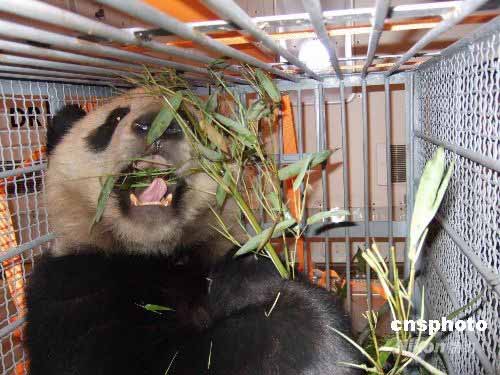 5月24日,8只奥运大熊猫“独享”世界最大最先进货机进京。这次运送奥运熊猫的专机,是南航完成运送救灾物资任务后,安排的目前世界上最大、最先进的波音747-400F型货机。这架飞机内外将进行全面的清洗和消毒,为大熊猫配备纯净水和新鲜嫩竹叶等机上美食。货机主舱温度控制在8℃至14℃,使大熊猫在机舱内依然能感受到与四川卧龙保护区一样的温度。图为进京大熊猫在恒温专机上用餐。中新社发 林宇定 摄