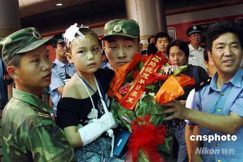 五月二十五日,一名来自四川广元的小伤员被两军解放军战士抱起。当日上午十一时零三分,满载着二百七十二名汶川大地震受伤人员的广元至郑州“运送灾区受伤亲人”专列抵达郑州火车站,他们将在当地九家指定医院接受治疗。中新社发 李志全 摄