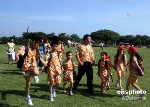 二十五日,海口。参加“为灾区孩子疗伤——爱心海南游”的九名来自四川绵阳安县、都江堰地区的地震受灾儿童,相聚在海口万绿园,开始他们为期三天两晚的海南之旅。此次参加活动的孩子都是暂时无家可归、无学可上,而到海南来投亲靠友的。图为在心理辅导志愿者的陪伴下,来自绵阳安县的孩子陶醉在游戏中。本次活动由《南国都市报》和海南中国青年旅行社联合发起。中新社发 高天胤 摄