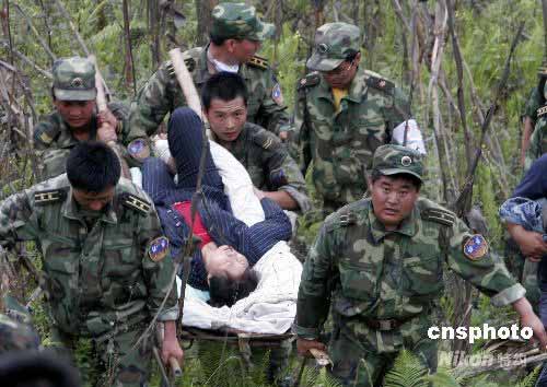 5月24日,驻豫某红军师、号称“铁军”的叶挺独立团22名官兵渡岷江、翻大山,将大山深处的四川省汶川县旋口镇黄家村3名在地震中受伤骨折的村民或用简易担架,或轮流背负,历经9小时转移到安全地区,并及时送往都江堰医治。中新社发 张晓理 摄