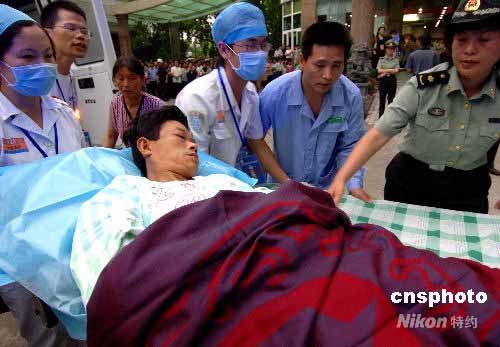 5月25日傍晚,24名四川地震灾区重伤员从成都乘坐航班抵达福州后随即由救护车队护送至南京军区福州总医院侨宾楼接受救治。图为伤员抵达南京军区福州总医院后该院医护人员全力救治每一位来自四川地震灾区的伤员。中新社发 刘可耕 摄