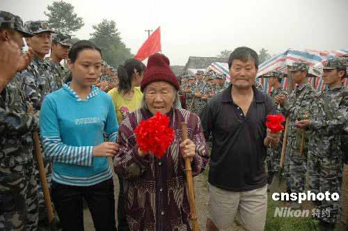 5月25日,四川绵竹市东北镇赤竹村89岁的朱传争老奶奶在家人的搀扶下,缓步走到中国海军陆战队官兵跟前,为他们戴上大红花。汶川大地震发生后,四川绵竹市东北镇赤竹村房屋几乎被夷为平地,财产损失颇为严重。中国海军陆战队从24起开始为村里搭建简易住房。为表感激之情村里的妇女连夜赶制了100朵大红花,送给海军陆战队官兵。中新社发 李唐 摄