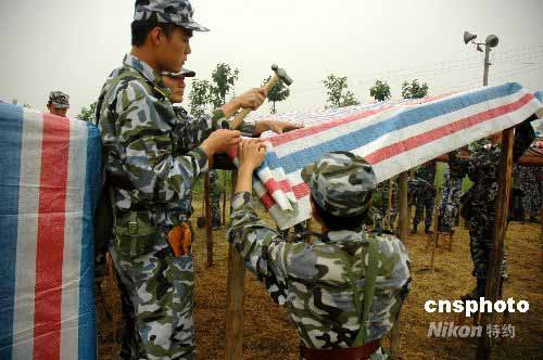 5月25日,中国海军陆战队某旅官兵为四川绵竹市东北镇赤竹村受灾民众紧急搭建简易住房。汶川大地震发生后,四川绵竹市东北镇赤竹村房屋几乎被夷为平地,财产损失颇为严重。中国海军陆战队从24日起开始为村里搭建简易住房。中新社发 李唐 摄