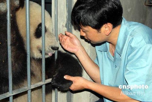 5月24日,来自四川卧龙的8只大熊猫平安抵达北京动物园,开始新的生活。此次进京的8只奥运大熊猫,是今年3月21日启动的“2008四川卧龙大熊猫奥运北京行”投票评选活动中,由广大网民从16只大熊猫里选出来的。这8只熊猫,雌雄各半,现在的年龄都在1岁9个月之间,属亚成体,正是最活泼可爱的年华。卧龙饲养员在京对在地震中受惊吓的熊猫美欣进行心理抚慰。中新社发 罗小韵 摄