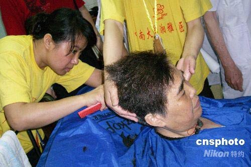 5月27日,湖南青年志愿者为住在湘雅二医院的四川震区伤员理发。目前,湖南已接收四川地震灾区伤员507名。中新社发 刘双双 摄