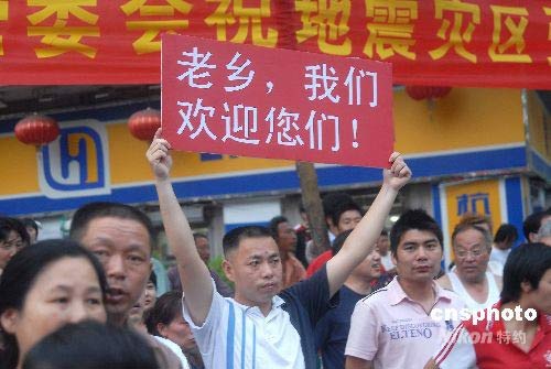 图为一位市民打出“老乡,我们欢迎您们”的横幅,欢迎从地震灾区来的伤员。