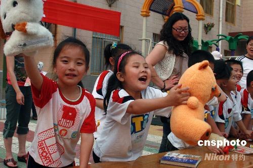 5月28日上午,河南油田五一社区黄山幼儿园开展“油城飘起黄丝带,师幼爱心献灾区”义卖捐款活动。200多名小朋友把自己平时喜爱的玩具、课外书等拿出来义卖,在园内摆起一个个“爱心”小摊。幼儿园将义卖款项做为孩子们“六一”儿童节的爱心礼物,捐献给四川灾区的小朋友。中新社发 李永哲 摄