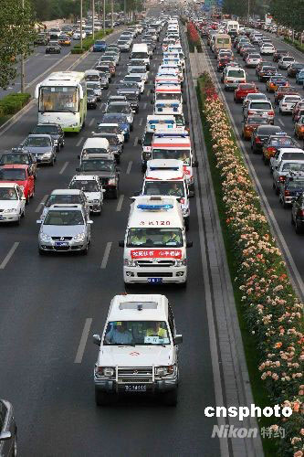 5月28日,首批91位四川灾区伤员抵达北京接受治疗,这批伤员分别来自地震灾区的绵阳和德阳,其中15岁以下的12人,70岁以上的3人。伤员病情基本稳定,伤情主要为四肢骨折等肢体外伤。伤员乘专列从绵阳火车站抵达北京,到京后他们被送往北京老年医院治疗。中新社发 富田 摄