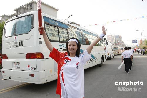 5月29日,奥运圣火在“能源之都”淮南传递。图为与白血病魔顽强斗争的女大学生,奥运火炬手孙洁,她高举火炬并为四川加油。她说她的生命奇迹不仅来自她的坚强毅力,更是来自社会的爱。她告诉四川人民,我们一起加油。 中新社发 张娅子 摄