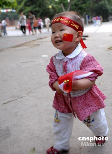 5月28日,一名幼童争做“圣火护跑手”。中新社发 廖攀 摄