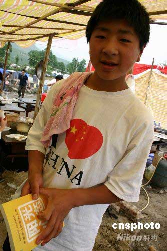 5月28日,在四川汶川大地震重灾区之一的彭州,尚未复课的小鱼洞小学学生杨青科,拿着一本《阳光心态》的书翻看,乐观面对震后生活。中新社发 杨杰 摄