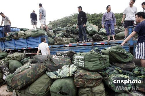 5月29日,受唐家山堰塞湖溃坝险情影响,绵阳市游仙区沈家坝东街社区居民陆续撤离至富乐山高地。图为一批帐篷运送到位。中新社发 杜洋 摄