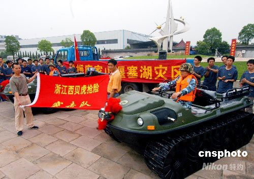 5月30日上午,浙江义乌,两辆“西贝虎”水陆两栖全地形车启程前往四川北川唐家山堰塞湖抢险。目前唐家山堰塞湖的总储水量已达1.4亿立方米,而且每天以500立方米的速度递增,一旦发生溃坝,将危及下游130多万人的生命财产。28日刚从什邡回来的义乌西贝文良特种车辆有限公司领导,又接到唐家山堰塞湖防洪抢险指挥部急需用水陆两栖全地形车电话。该公司连夜组织加班,突击生产了两辆性能最优的水陆两栖全地形车,并根据唐家山堰塞湖抢险可能遇到的困难,增配了自动牵引钩、牵引钢丝绳、爬坡履带、水上推进的螺旋桨等。30日中午,陈根林等四名刚从什邡抗震救灾前线回来的公司职工,组成“西贝虎”抢险突击队,再赴抗震救灾前线抢险。中新社发 张建成 摄