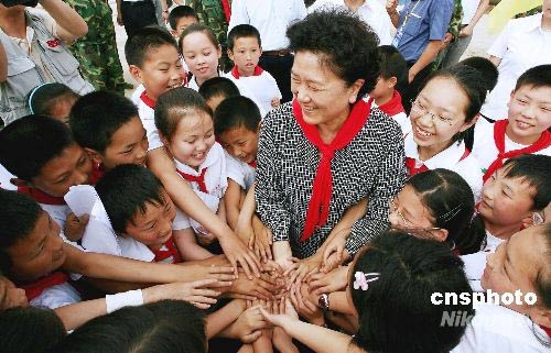 5月30日,中共中央政治局委员、国务委员刘延东来到四川灾区,与来自北川的学生在绵阳八一帐篷学校共庆“六一”儿童节。中新社发 蒲滔 摄