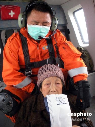 5月31日,90岁老奶奶被民航直升机南航珠海S76型7307号飞机成功救出。家住绵竹市清平天池南木沟的老人,地震前独居深山。5.12汶川地震发生时,老人在室外乘凉,腰部被山石击伤。因出山和进山路中断与外界隔绝联系,一直被困深山中。19天来靠吃野菜维持生命。民航直升机抗震救灾基地接到绵竹搜救部队的消息后,当即派出两个机长刘洋、段俊德执行飞行任务,交通部南海第一飞行队救生员李春林、绞车手宋乐平一同前往。由于地形复杂,山式狭隘,峡谷电线纵横交错,没有可着地条件,搜救人员只好实施空中救援。上午10时40分成功将老人救出。中新社发 张钰昱 摄