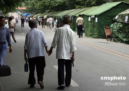 六月一日,唐家山堰塞湖避险疏散预案三分之一溃坝方案涉及的下游群众,已全部撤离到安全地带。 一对年过古稀的老人牵手在绵阳市游仙区绵山路上新建的疏散安置点悠闲散步。中新社发 王瑶 摄