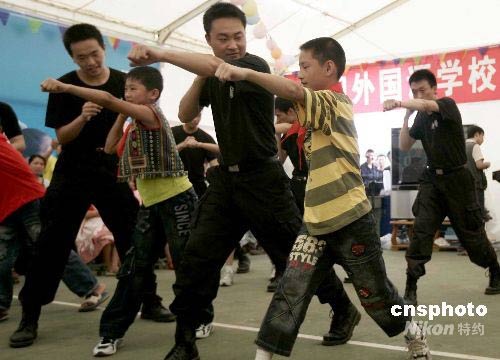 6月1日,在四川绵阳九州体育馆受灾民众安置区,几名男孩向特警学习军体拳。中新社发 杜洋 摄