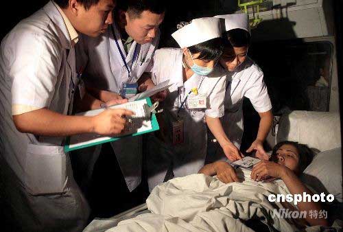 六月一日晚十一时许,四十位四川地震伤员转移抵达福建泉州,分乘救护车前往泉州四家医院接受救治。在救护车上,交接医生第一时间了解病人情况并做出移动方案。中新社发 傅丹丹 摄