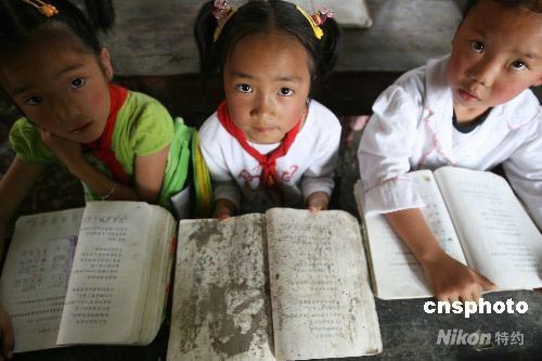6月1日,家住四川安县秀水镇大泉村的小学生胡一凡在新建成的秀水三小上课。由于原来学校的教室在地震中倒塌,胡一凡已经有19天没有上课读书了。在新建成的教室里,尽管课本沾满了泥水,但她已经很满足了。中新社发 董亮 摄
