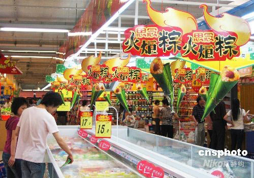 6月2日,广西北海市一家超市应即将到来的中国传统节日端午节而推出奥运“火炬粽”,其独特的火炬造型和“祝福北京奥运”的寓意,吸引了不少顾客选购。随着2008北京奥运会的临近,商家纷纷借机推出具有奥运元素的商品促销。 中新社发 范静 摄
